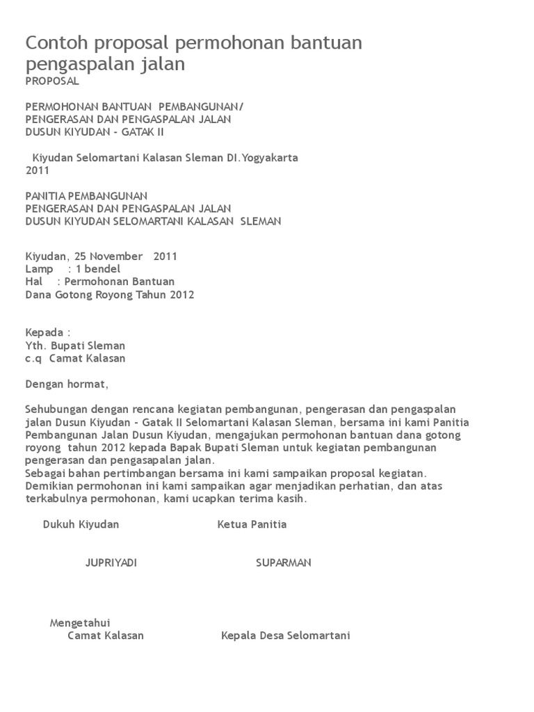 Contoh Proposal Permohonan Bantuan Pengaspalan Jalan from imgv2-1-f.scribdassets.com Misalnya, kegiatan desa, kampus, sekolah, atau bahkan penggalangan dana untuk bencana dan lain sebagainya. Belum lagi kondisi jalan di desa bojonggedang yang rusak, jumlah kendaraan yang terbatas dan tidak cocok untuk membawa orang sakit ke puskesmas atau rsu, menjadi kendala tambahan yang membuat kami sangat prihatin. Contoh proposal pembangunan jalan pada bab 1, kamu dapat menulis judul dengan latar belakang atau dasar pemikiran. Secara geografis banjar dinas (nama desa/alamat) terletak di pesisir pantai yang lautnya memiliki beragam biota laut baik ikan hias maupun ikan konsumsi. Pada blog kali ini saya akan membagikan tentang contoh proposal yang diberikan tugas guru sma dan saya membuat proposal tentang jalan sehat untuk menjalin keakraban antar warga desa. Contoh proposal singkat (usaha, penelitian, kegiatan, dan proyek). Paragraf selanjutnya, kamu dapat menguraikan kondisi hari ini jalan yang akan diperbaiki. Proposal lazimnya dikenal sebagai sebuah dokumen yang berisi rencana kegiatan yang terancang secara sistematis dan terperinci.